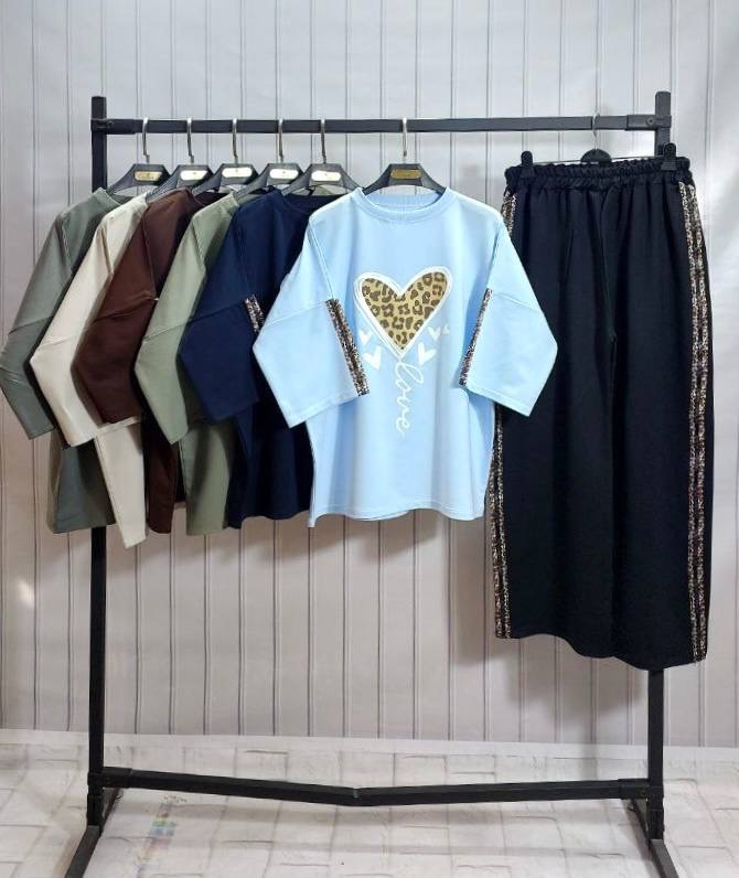 ست تیشرت آستین سه‌ربع و شلوار بگ زنانه طرح قلب - پارچه سوپر گلکسی ترک - فری سایز ۴۰ تا ۵۰ - ۸ رنگ کپی کپیناموجود