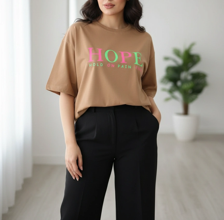 چه به دنبال یک استایل کژوال روزمره باشید و چه بخواهید لوکی شیک و متفاوت بسازید، این تیشرت همراه ایدهآل شماست. پیام HOPE (امید) روی این تیشرت، هر روز یادآور این است که با امید و انرژی مثبت، میتوانید بهترین نسخه خود باشید.