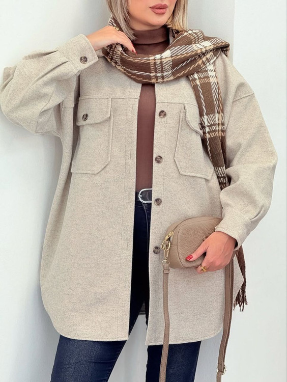 دو جیب جانبی با عمق مناسب $18$ سانتیمتر، امکان نگهداری تلفن همراه، کلید، کارت و سایر وسایل کوچک را فراهم میکنند. دوخت جیبها به گونهای است که حجمی اضافه ایجاد نمیکنند و خطوط کلی مانتو را حفظ میکنند. یقه ساده و آستینهای بلند با نسبتهای استاندارد، ظاهری متعادل و هماهنگ به مانتو میبخشند.