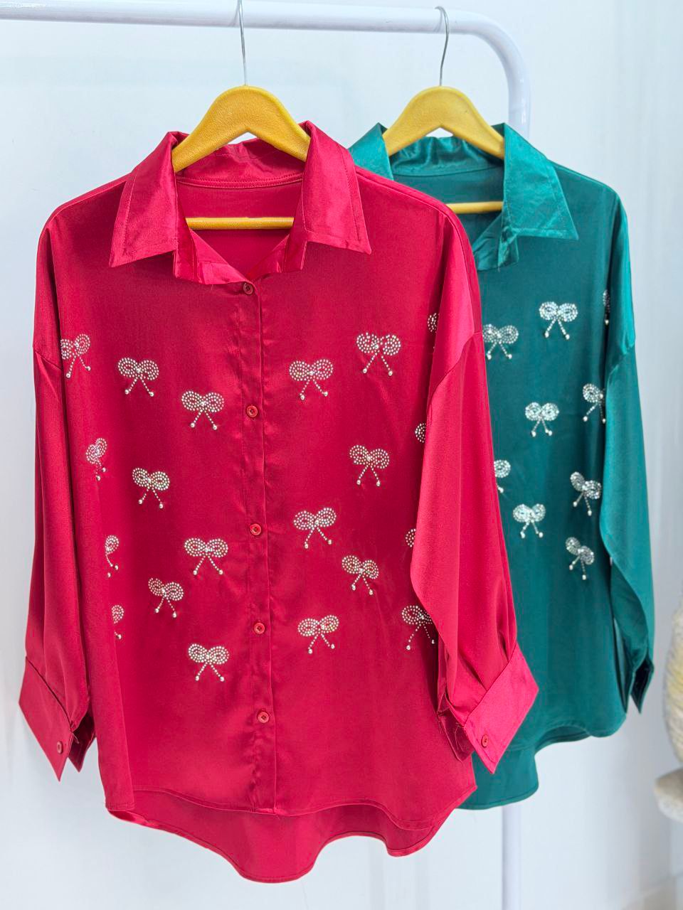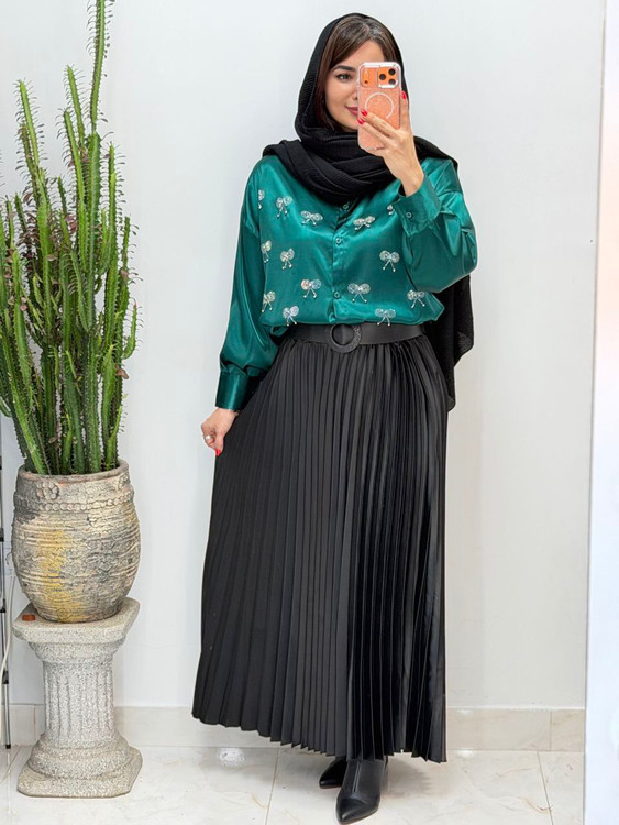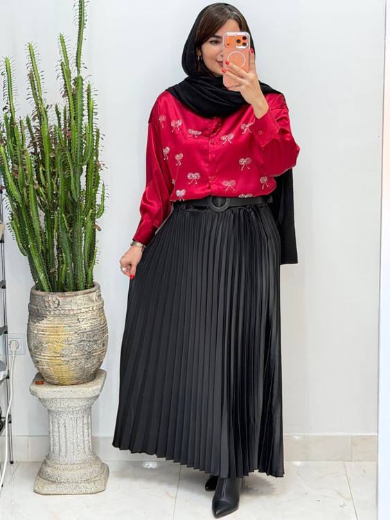ست شومیز دامن یلدایی ساتن ال ایکس | فری سایز 38-48 | نگین رزین مروارید | 2 رنگ