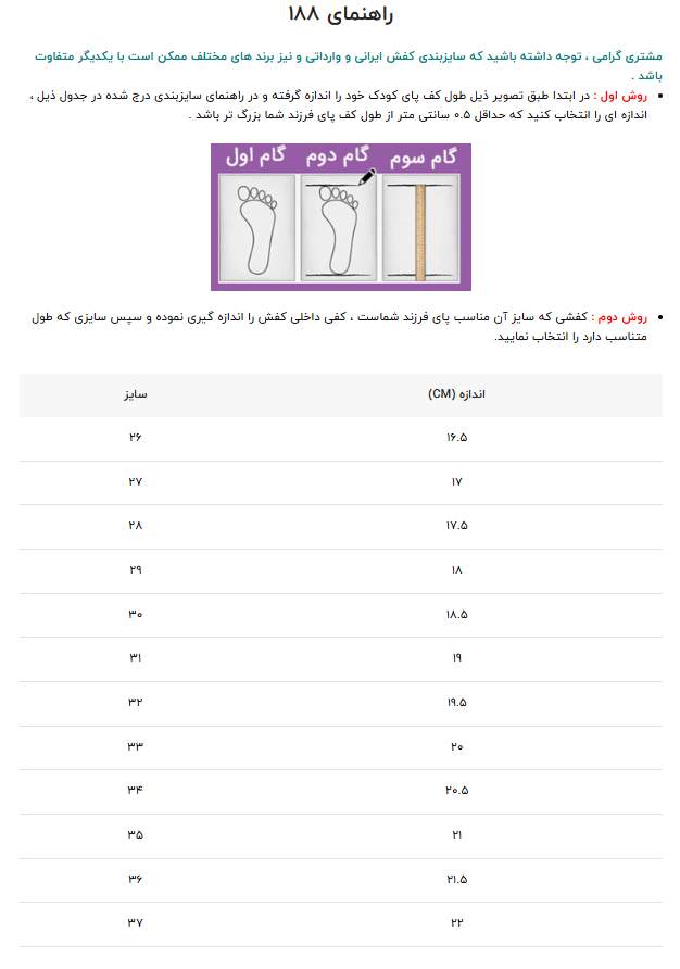 سایز بندی: 26 تا 37 (راهنمای سایز بندی در قسمت توضیحات را بخوانید))